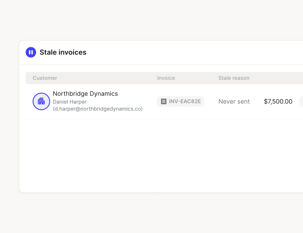 Invoices in draft or unsent for 7+ days get flagged automatically. Nothing sits in the pipeline without you knowing.